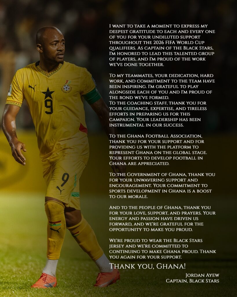 The captain of the Ghana Black Stars, Jordan Ayew, has extended his heartfelt gratitude to the people of Ghana for their unrelenting support following the team’s successful qualification for the 2026 FIFA World Cup in Canada, Mexico, and the United States of America.