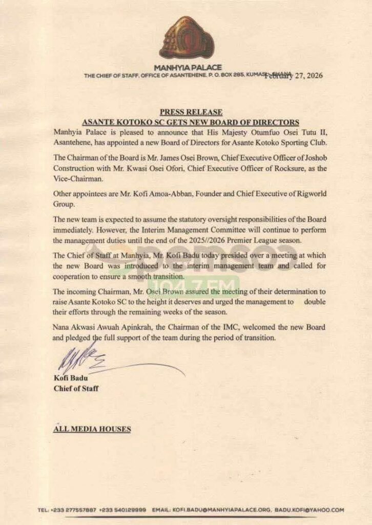 Manhia Palace has officially announced that His Majesty Otumfuo Osei Tutu II, Asantehene, has appointed a fresh Board of Directors for Asante Kotoko Sporting Club. The new board is chaired by Mr. James Osei Brown, Chief Executive Officer of Joshob Construction, with Mr. Kwasi Osei Ofori, Chief Executive Officer of Rocksure, serving as Vice‑Chairman. The other appointee is Mr. Kofi Amoa‑Abban, Founder and Chief Executive of Rigworld Group.