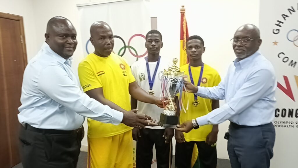 Ghana’s wrestling team paid a courtesy call on the Ghana Olympic Committee (GOC) on Wednesday, April 15, 2026, to present two gold medals and a trophy won during a training tour in Guinea-Bissau.